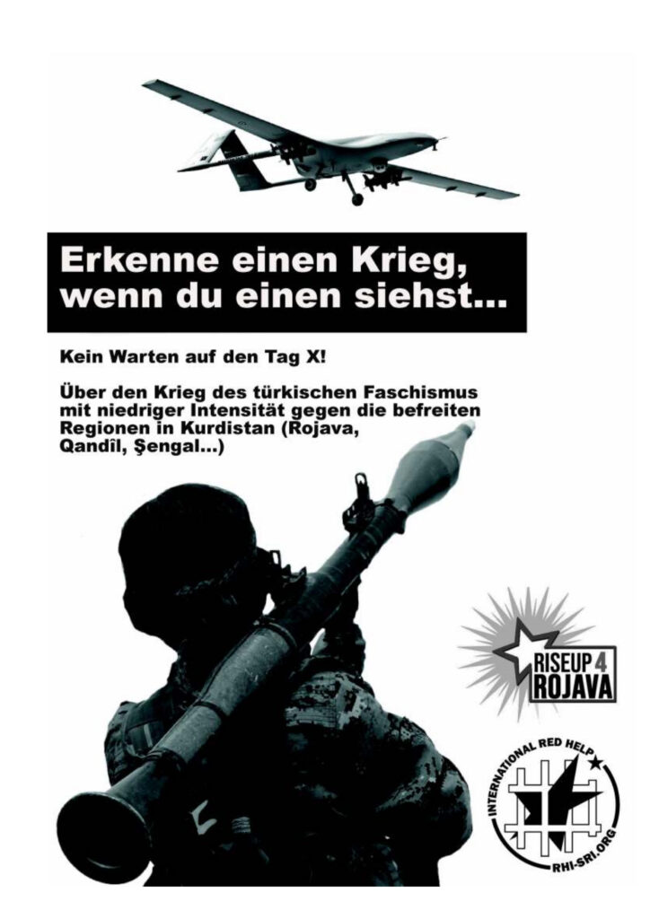 Eine Broschüre der Internationalen Roten Hilfe und Riseup4Rojava über den „Krieg niedriger Intensität“ gegen die befreiten Gebiete Kurdistans (Rojava, Qandîl, Şengal) und die Notwendigkeit so zu handeln, als wäre es ein klassischer Krieg.